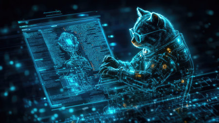 Futuristic Blue Holographic Cat in Cyberspace Exploring the Intersection of Technology and Nature.