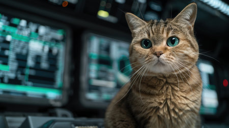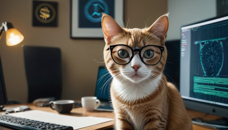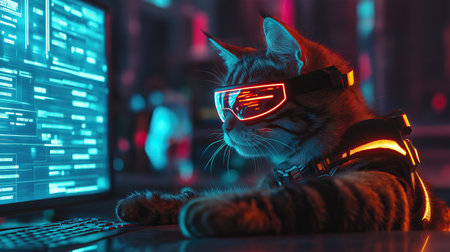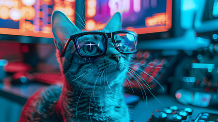 A captivating image of a feline character donning a pair of glasses immersed in a futuristic workspace The scene is rich with vibrant colors holographic screens and various high tech gadgets creating