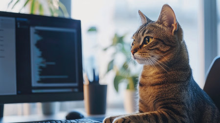 A serious cat focused on a computer screen in a modern office, showing the funny concept of a working cat.