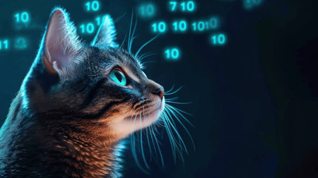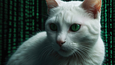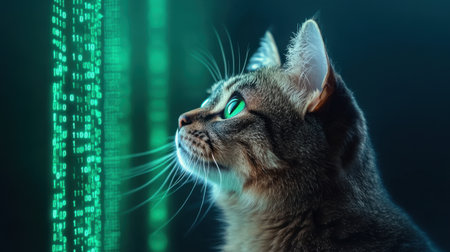 Futuristic scene of cat with vivid green eyes gazing into glowing binary code stream