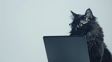 Black cat in glasses using a laptop against a white studio backdrop, perfect for themes of technology, intelligence, and humor.