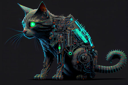 Create a futuristic cyberpunk-style cat with pixel art-style mechanical body parts.Generative AI