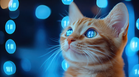 Bright-eyed cat immersed in cyber space, eyes reflecting glowing binary numbers