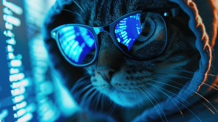 Cat as hooded hacker with reflection of computer code in glasses. Concept of spy, ransomware, technology, hack, funny animal, cyber security, scam, crime and virus. Generative AI