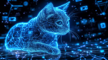Holographic Cat, Blue Wireframe Feline on Dark Background, Futuristic Technology Concept