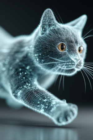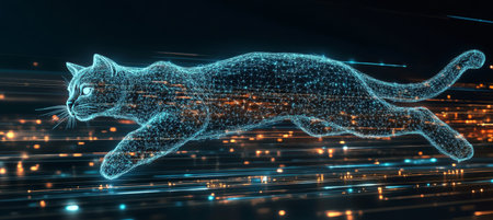 Holographic Cat Running Through Digital Space, Representing Modern Technological Innovation