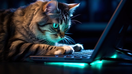 Hacker works in dark room, cat wearing glasses uses computer. Concept of spy, ransomware, cyber technology, hack, vulnerability, humor, scam, fraud and virus. Generative AI