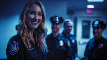 A woman with police officers standing in the middle of a meeting with happy expression.