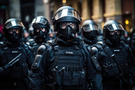 A team of Special police forces cordon at the demonstration, blocking street protests. Generative Ai
