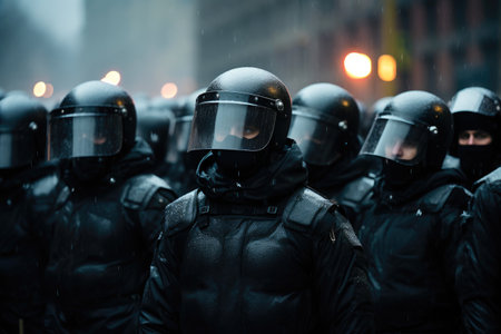 Group riot police with protective gear and shields standing on the streets by protest. demonstration police