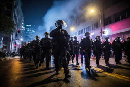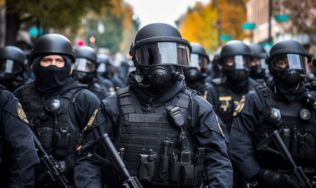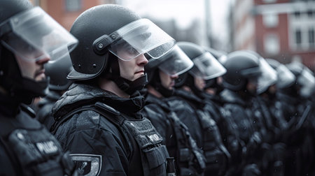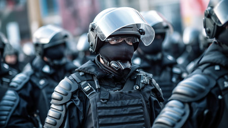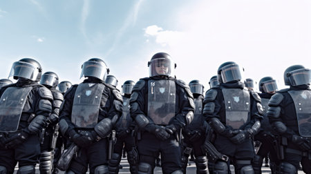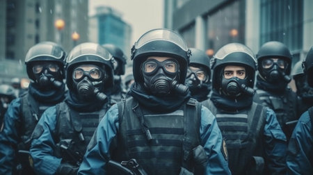 Police squad wearing uniform on the city street. Law enforcement during protests. Created with Generative AI