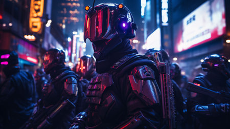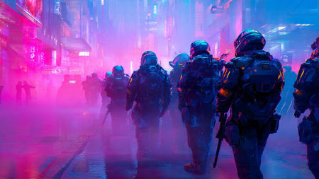 Group of armored police officers walking down a foggy city street with neon lights