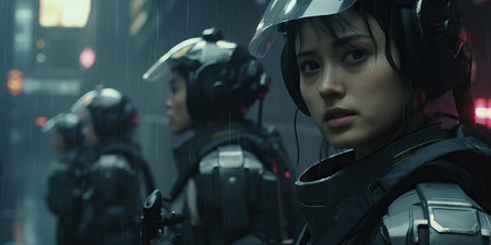 woman police group in cyberpunk city at night, dark futurist image, rainy day, riots in the slums