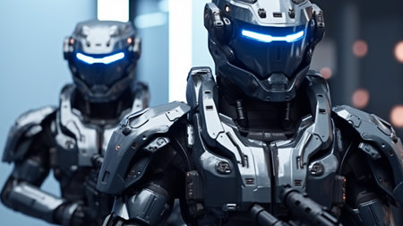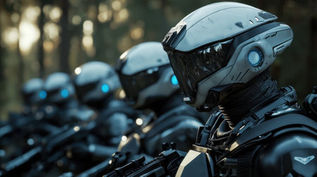 Witness a high-resolution image of a futuristic robot army, cybernetic soldiers in uniform showcasing AI evolution Detailed armor, glowing visors, and immersive lighting highlight a dystopian future Perfect for sci-fi fans and tech blogs, explore metallic humanoids ready for action, reflecting tomorrow's warfare and technological advancements AI Generative