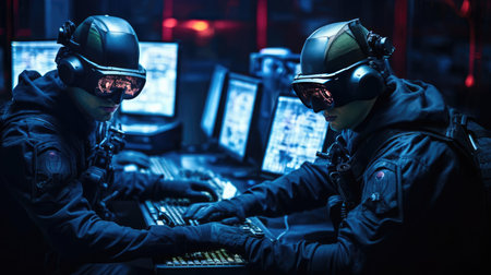 Military at computers in a dark room