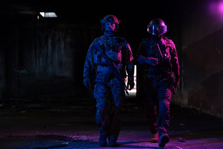 Modern warfare soldiers in dark with combat ammunition and weapons in the hands of equipped laser sights are in battle order. Mixed media.