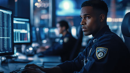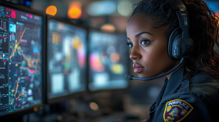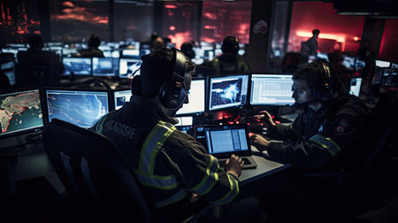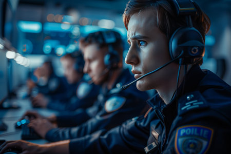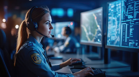 Police officers in a high-tech 911 call center, ensuring public safety through quick and efficient emergency response.