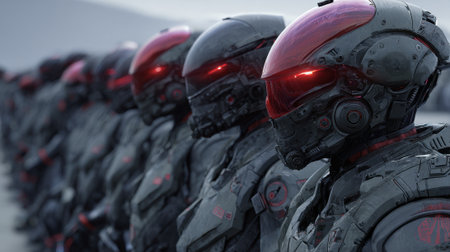 A row of sleek military robots stands at attention in a futuristic setting during twilight. Their red-lit visors and metallic bodies reflect advanced engineering and design.