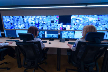 Security guard monitoring modern CCTV cameras in a surveillance room. Group of security guards sitting and monitoring.