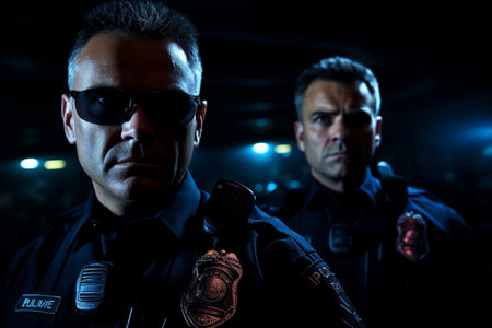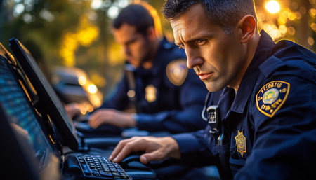 Focused Police Officers Using Computers in Vehicle, Law Enforcement Technology for Fast Response.