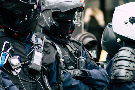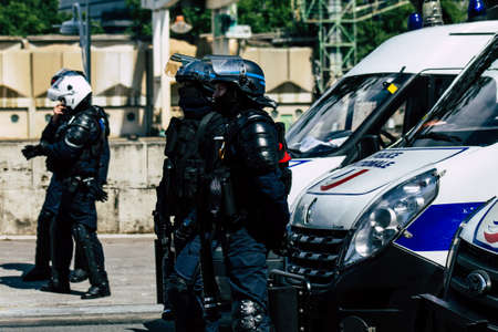Paris France May 11, 2019 View of a riot squad of the French National Police in intervention during protests of the Yellow Jackets against the policy of President Macron in Paris on saturday afternoon