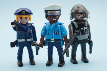 Mulhouse - France - 9 December 2020 - Closeup of playmobil characters on blue background - policemen with uniforms and shotguns