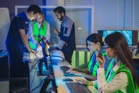 Team of security guards working on computers in surveillance room at night