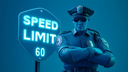 A police officer stands next to a glowing SPEED LIMIT 60 sign, arms crossed, enforcing traffic laws.
