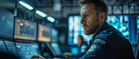 Focused Female Security Officer Monitors Multiple Screens in Surveillance Control Room