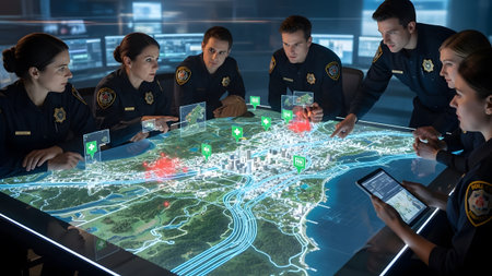 Police officers collaborate over a holographic city map with data overlays on a table. Clear deta...