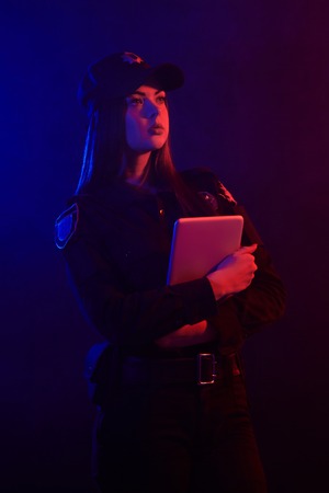 Redheaded female police officer is posing for the camera against a black background with red and blue backlighting.