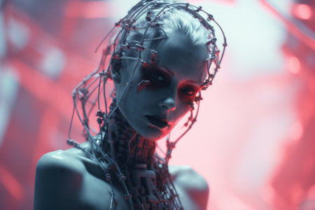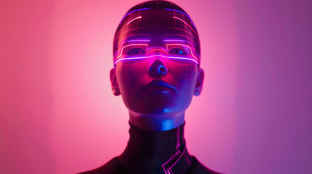 A striking portrait of a futuristic woman with a sleek bob haircut and robotic features. The cybernetic aesthetic is enhanced by striped light projections on her face and a metallic collar, representing artificial intelligence and sci-fi concepts.