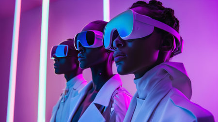 A trio of futuristic models with neon visors in a vibrant, high-tech setting, showcasing bold and innovative fashion.