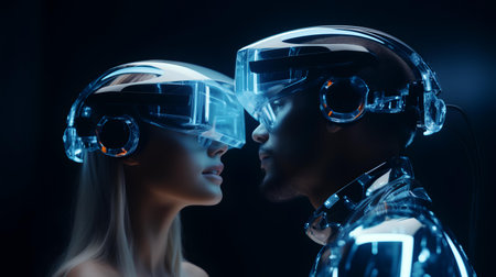 Side view of futuristic woman and man in vr glasses on black background