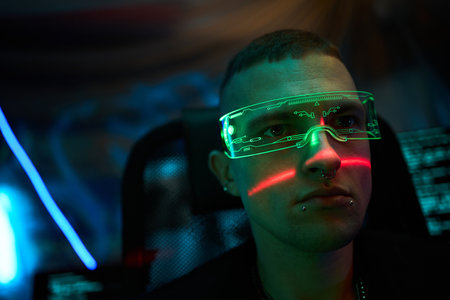 Young adult Caucasian man wearing futuristic illuminated visor standing in dark room with neon blue and green lighting, facing sideways, displaying hacker and cyber club concept