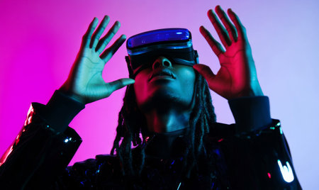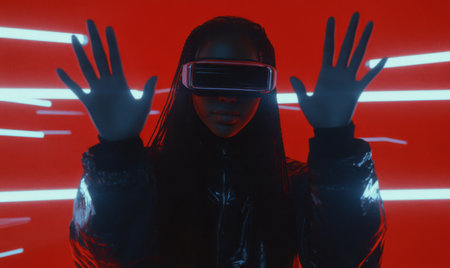 Young woman wearing glowing VR headset illuminated by neon lights. Concept of immersive technology and virtual interaction in augmented reality