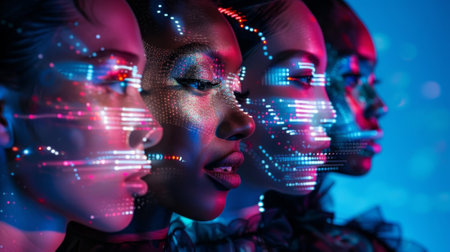 A group of models with uniquely designed makeup looks created with the help of AI technology