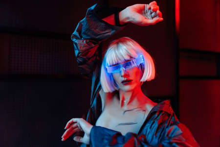 Blonde in cyberpunk style. Futuristic glasses on a woman.