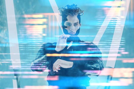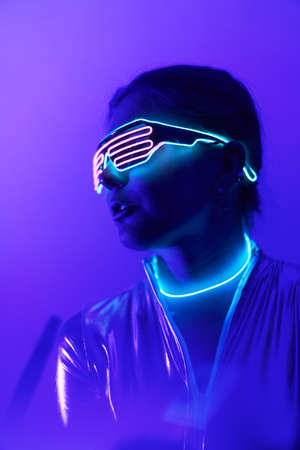 Futuristic eyewear. Young man with curly hair is indoors illuminated by neon lighting.