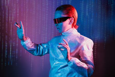 Woman, dressed in futuristic holographic clothes and eyeglasses touch space by finger. Cyberpunk girl with virtual touching pad and matrix digital numbers background in neon blue and pink light.