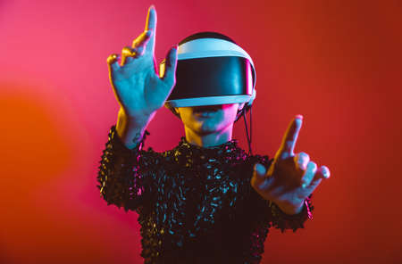 Teen girl using vr headset is in virtual reality cyberspace futuristic neon colorful background. The concept of the metaverse
