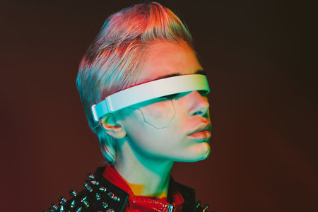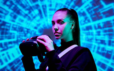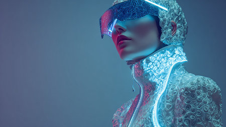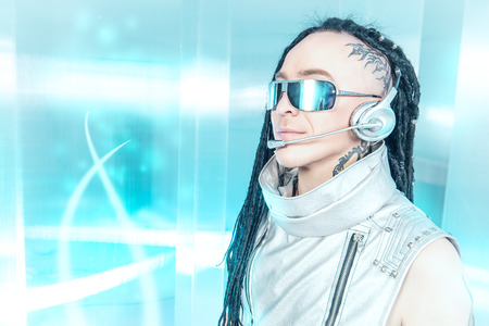 Cyberpunk style portrait of beautiful young woman in futuristic costume.