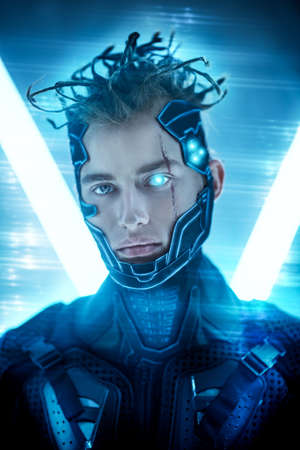 Cyberpunk style portrait of man in futuristic costume.