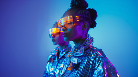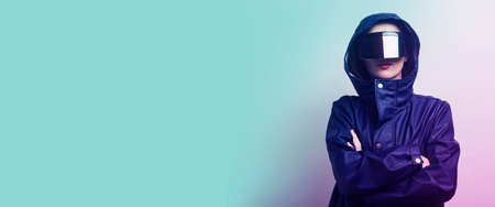 Neon portrait of woman, dressed in futuristic holographic clothes and glasses. Portrait of a cyberpunk girl. Neon blue and pink light. Virtual reality glasses. Fashion, futuristic generation concept.
