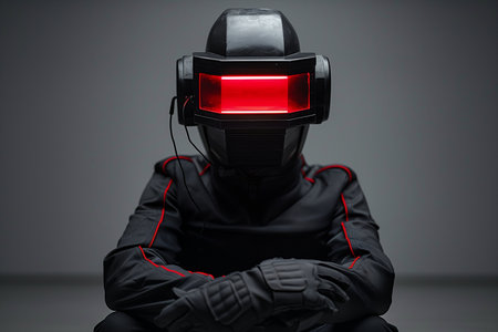 A man wearing a virtual reality headset with a red light on a gray background