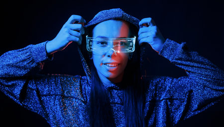 Futuristic woman in neon light with holographic smart glasses