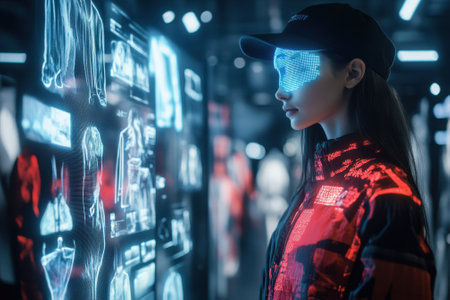 A person interacts with a digital interface showing clothing designs in a futuristic store.