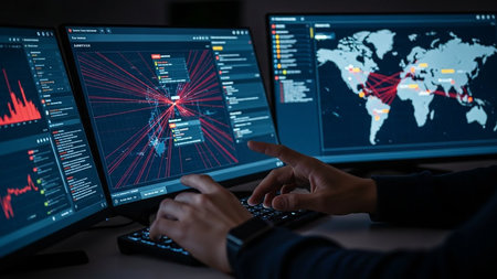 A cybersecurity analyst's hands type on a keyboard while monitoring global threats on multiple computer screens displaying data and maps.