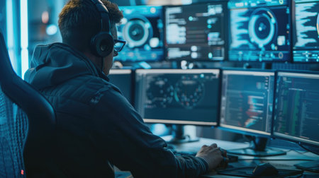 A military operator in tactical gear looks at a control room with multiple screens. Command center and strategy concept