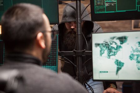 Team of international and dangerous hackers stealing technology. Bearded hacker with hoodie.